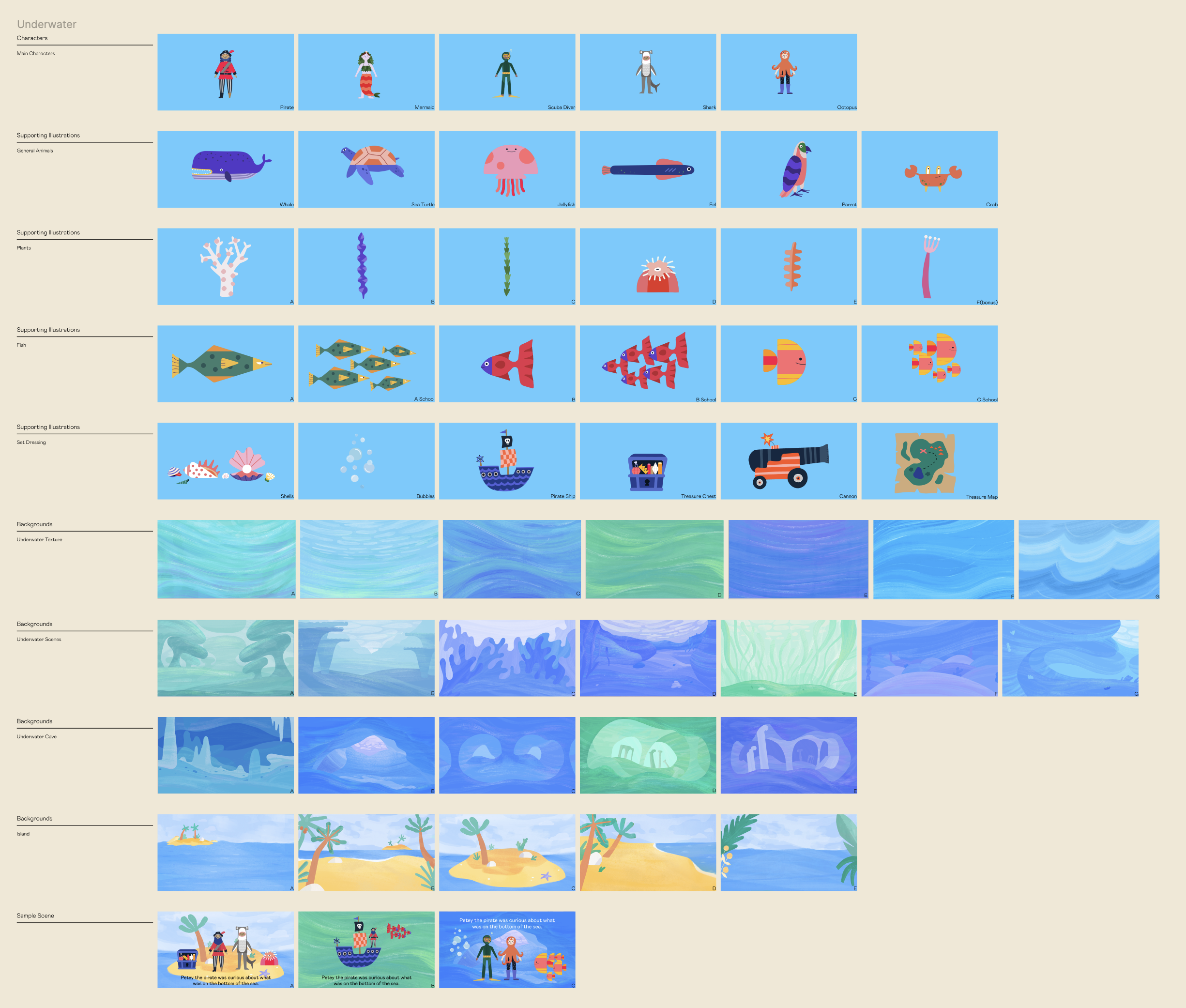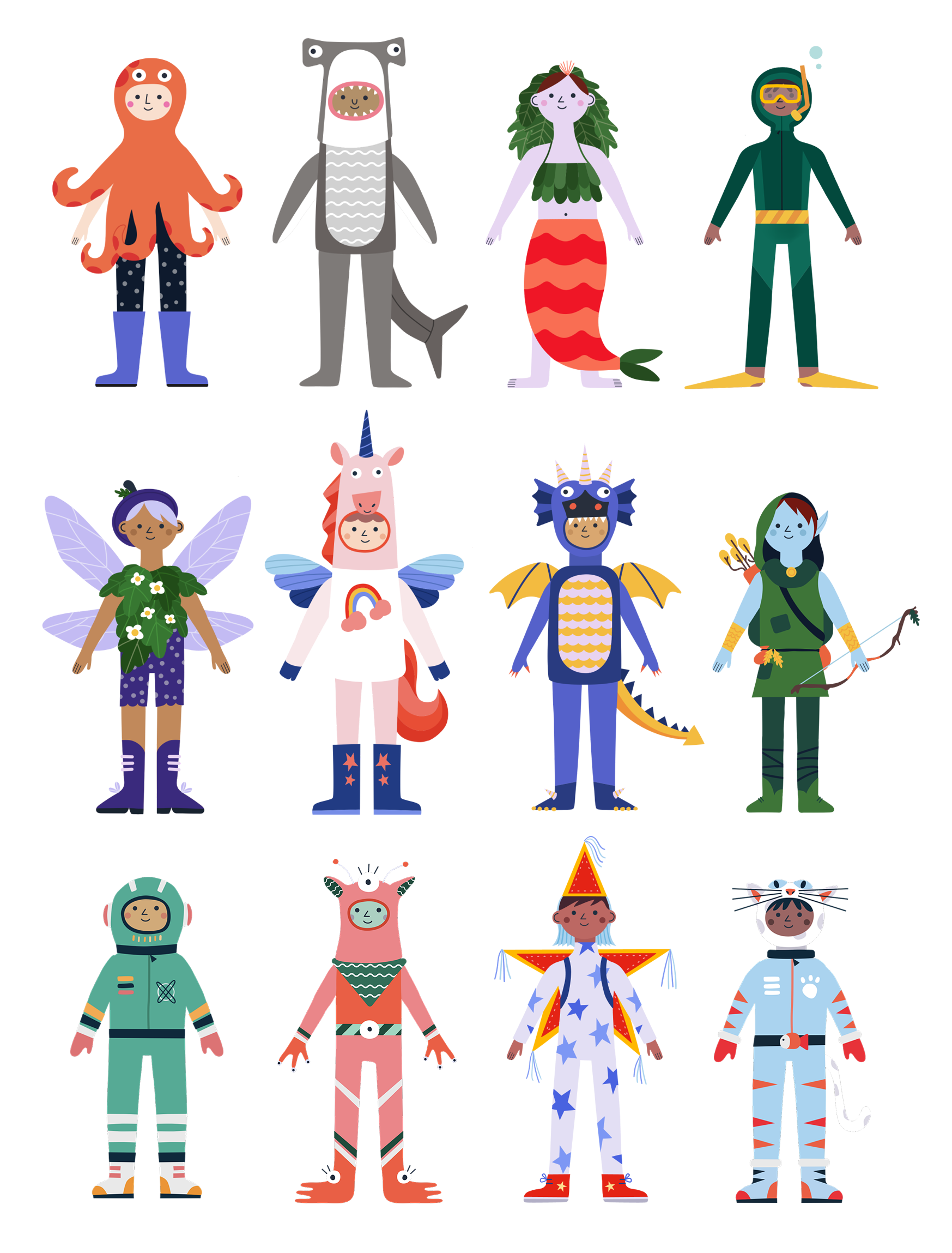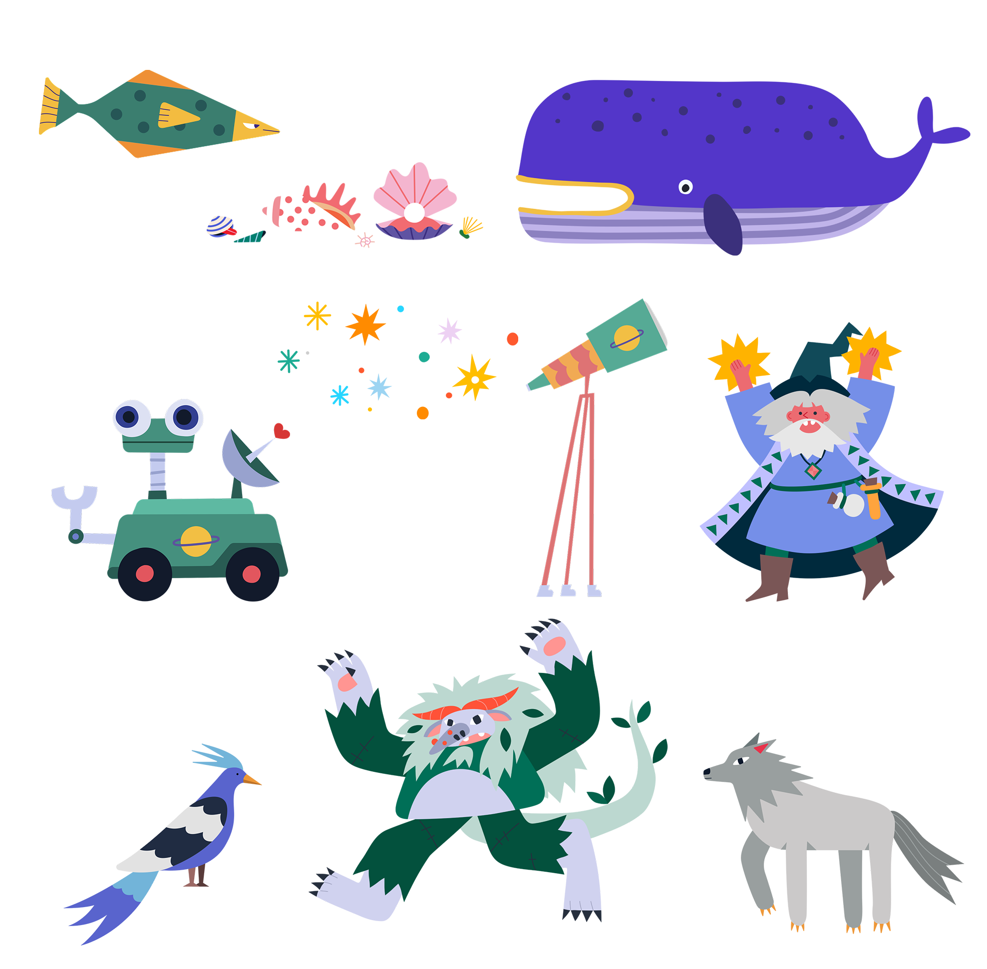 While working at BUCK, I art directed an interactive children's book for Amazon. The project brought to life magical environments including underwater realms, outer space adventures, and enchanted forests, each filled with hundreds of detailed illustrated elements and a colorful cast of characters, from mermaids and monsters to space explorers. Every character was animated to bring the stories to life. The project included 15 main characters, 25 customizable characters, over 70 backgrounds, and over 60 supporting illustrations.