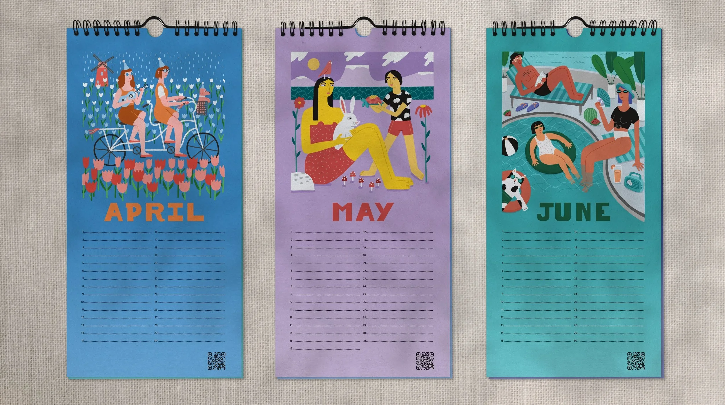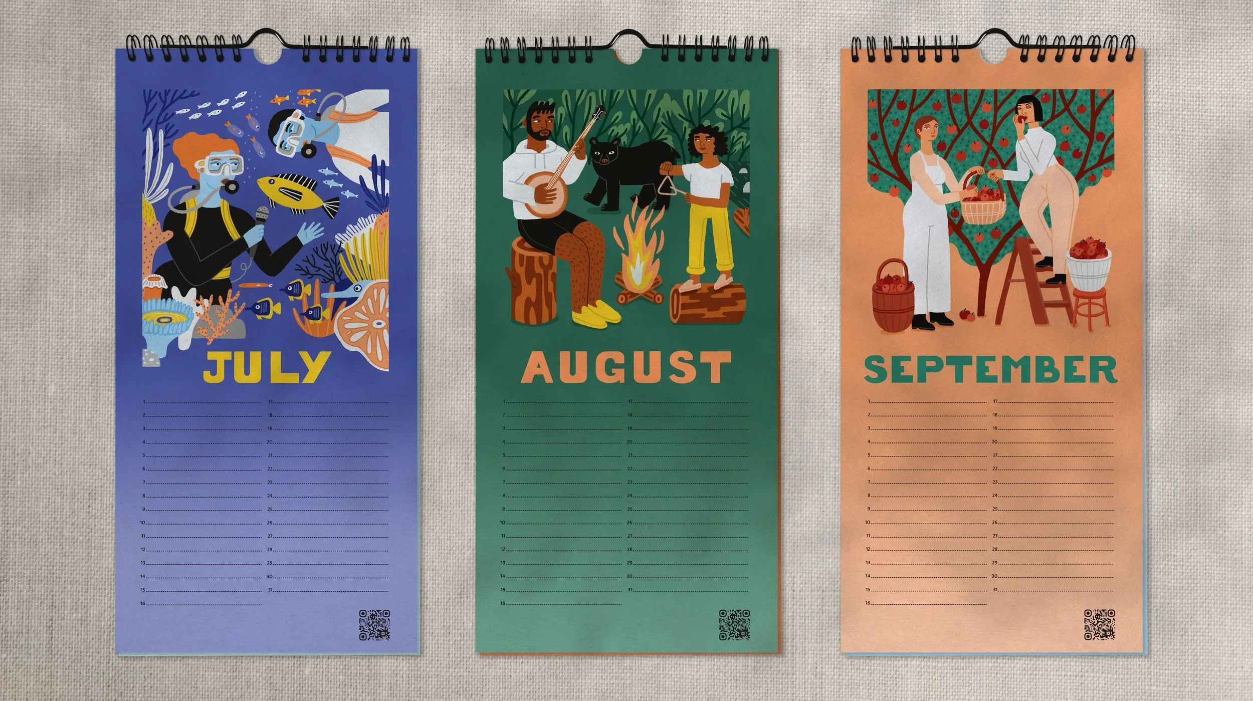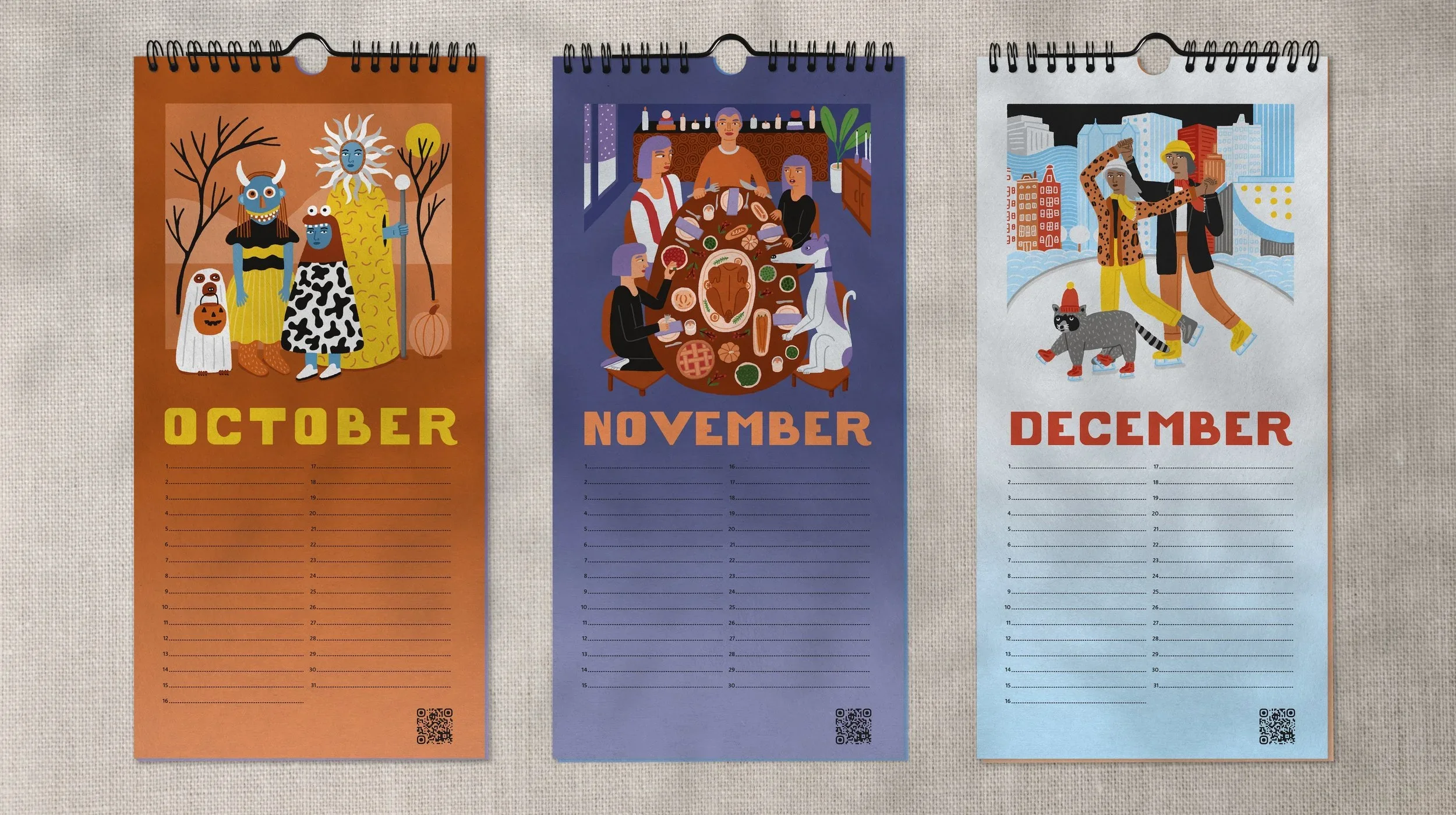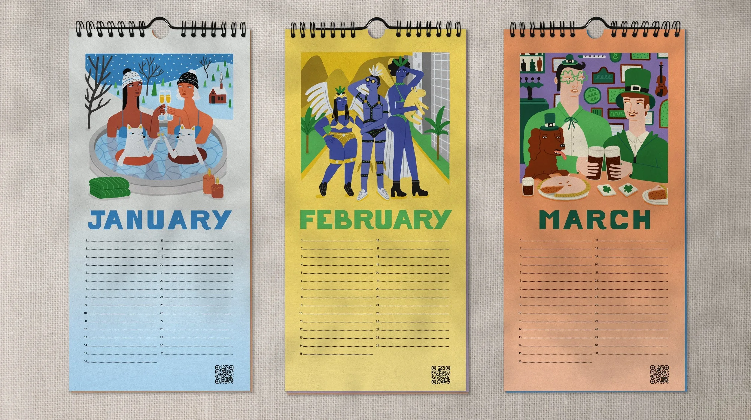 Antfood commissioned me to illustrate each month of MusicCal, a "phygital" birthday calendar that bridges print and digital. Rooted in the Dutch tradition of perpetual birthday calendars, the printed calendar pairs each month's illustration with a QR code linking to a generative music experience - one that composes a unique ambient piece for each listener based on their location, the date, the time of day, and the weather outside.