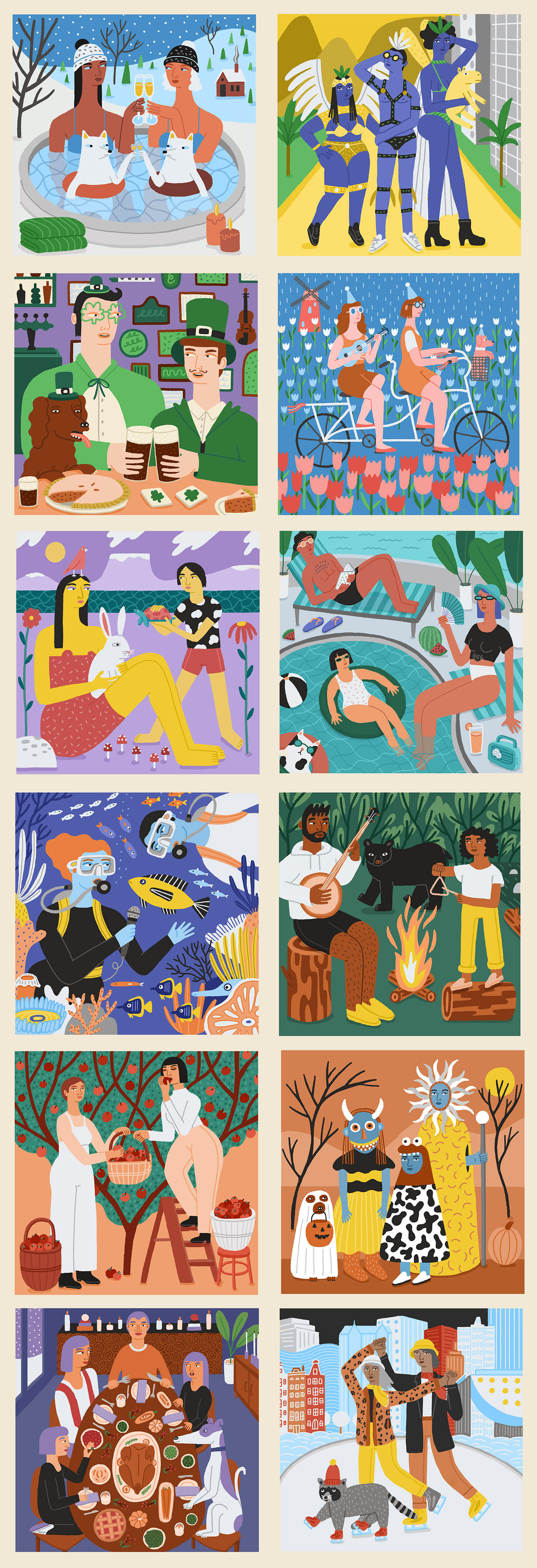I illustrated all 12 months, keeping the work simple and expressive while representing the full range of friendships and families across Antfood's home cities - New York, Los Angeles, São Paulo, and Amsterdam. The project was recognized with an American Illustration 44 award.