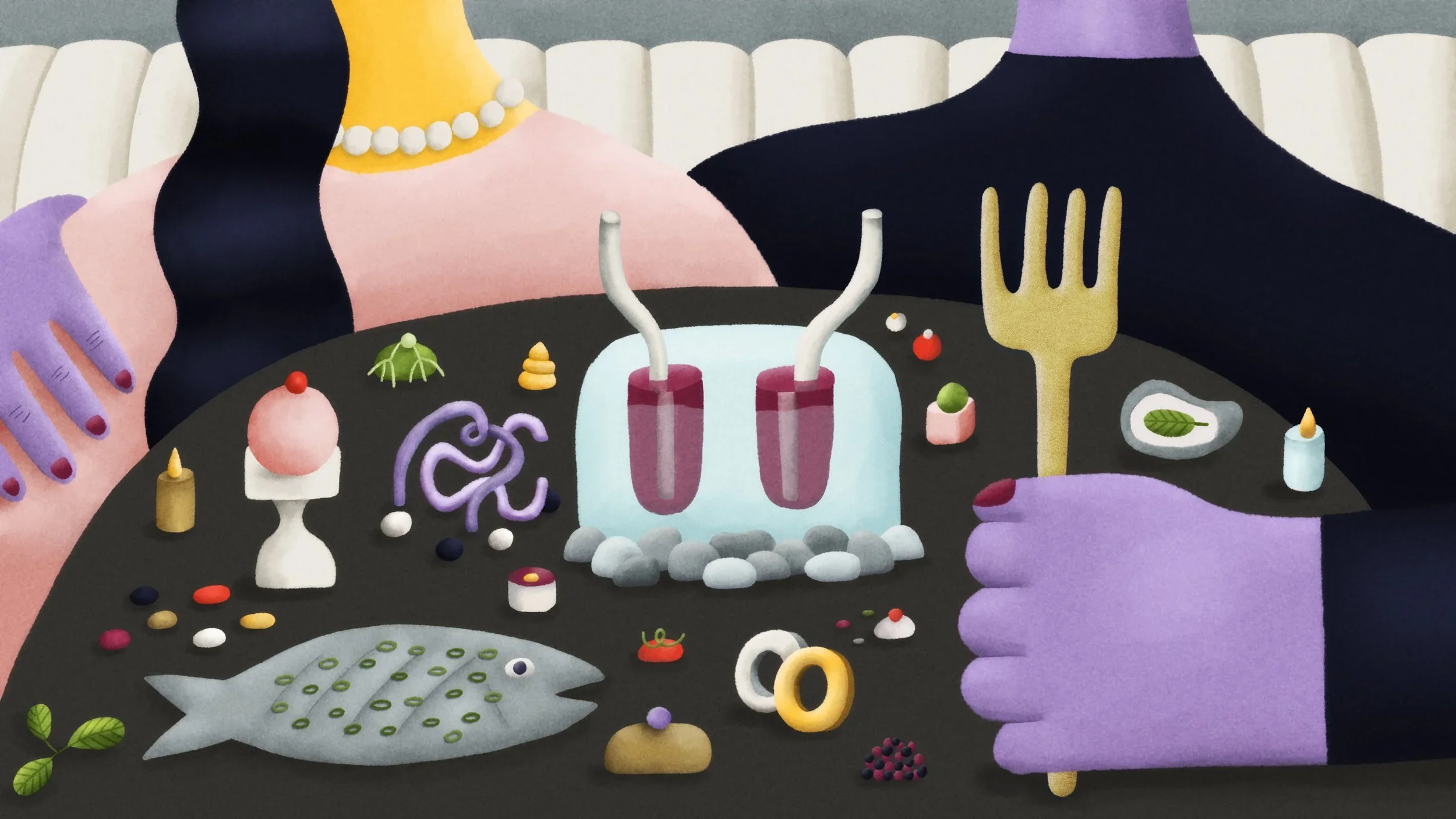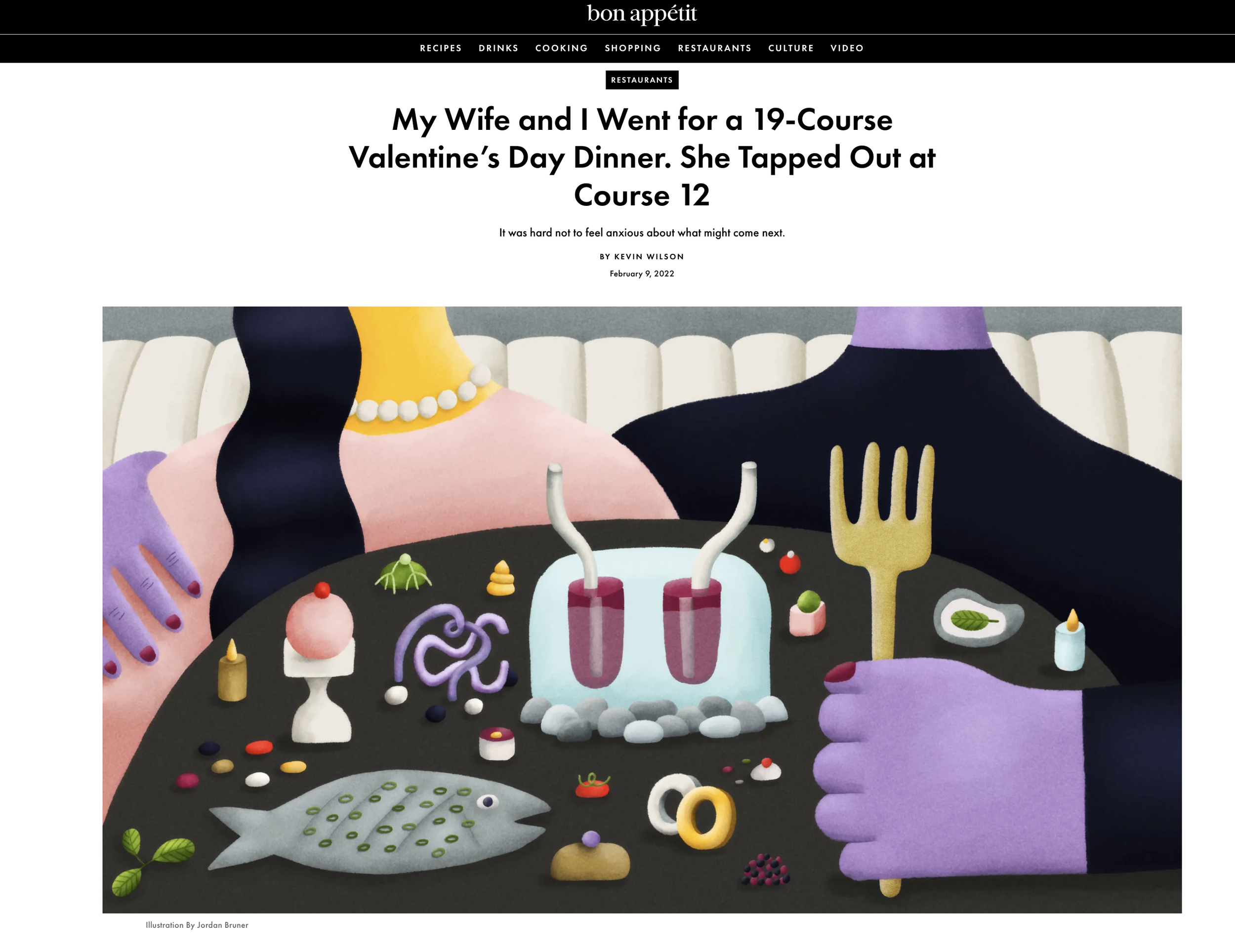 A longtime Bon Appétit reader, I was thrilled to be commissioned to illustrate the article My Wife and I Went for a 19-Course Valentine's Day Dinner. She Tapped Out at Course 12. I had a lot of fun imagining the procession of molecular gastronomy courses in all their absurd, elaborate glory.