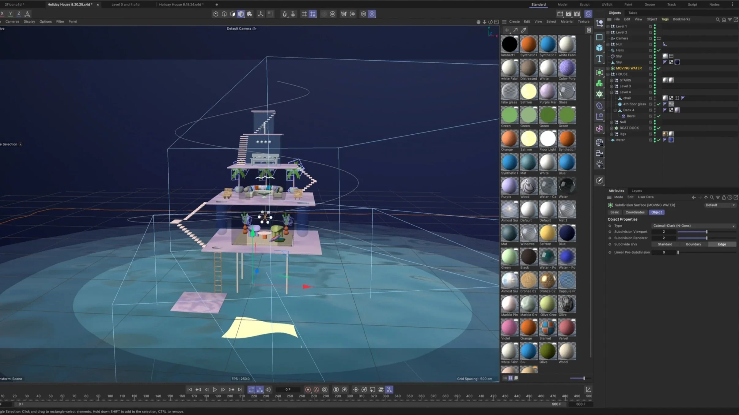 This was a self-initiated project to get more comfortable with Cinema 4D. I'm obsessed with houses and architecture, and I found myself imagining a house on stilts in the middle of the ocean — a dystopian solution to climate crisis. I experimented with textures, lighting, and color to build out the dream-like atmosphere.