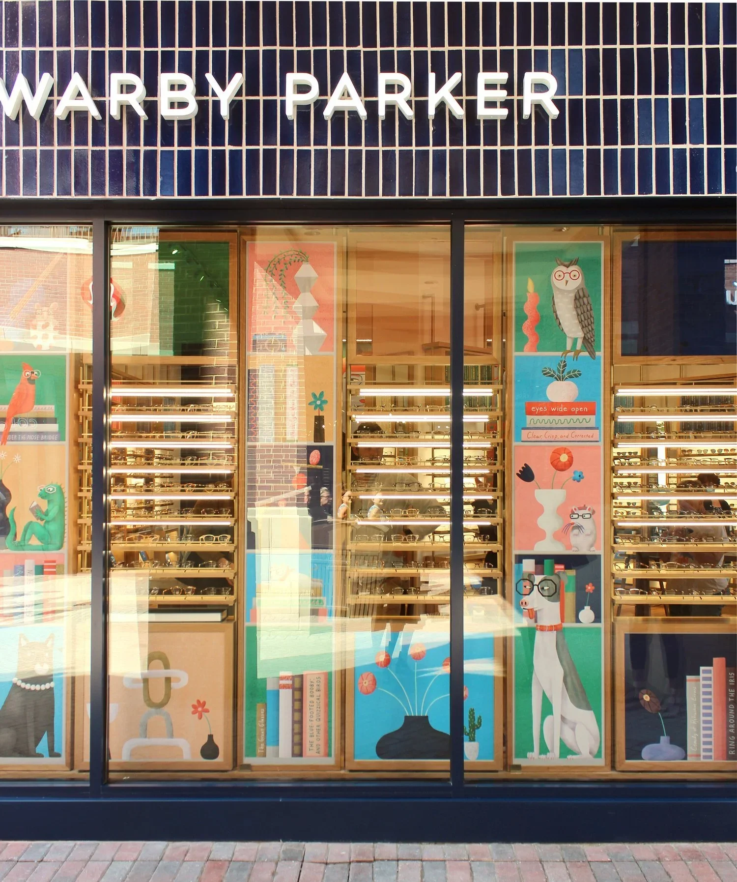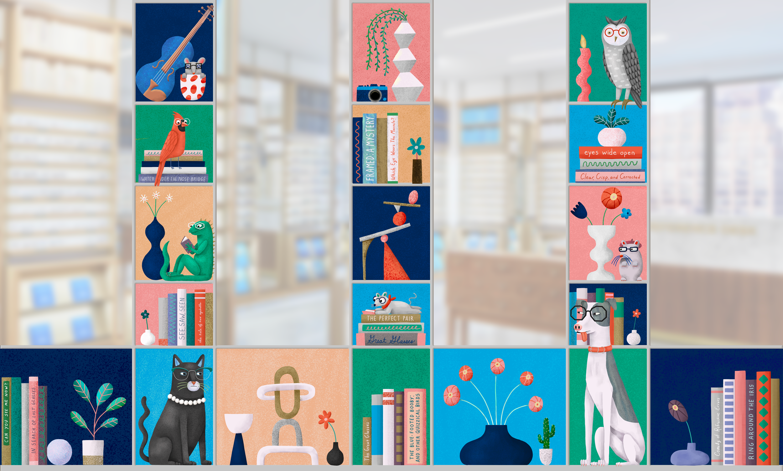 For the massive interior mural, I depicted a family portrait complete with pets, where everyone is wearing glasses. Outside, the exterior mural layers colorful home goods, books with eyeball-themed titles, and even more animals in glasses. A print of the interior mural now hangs in Warby Parker's SoHo, NYC location.