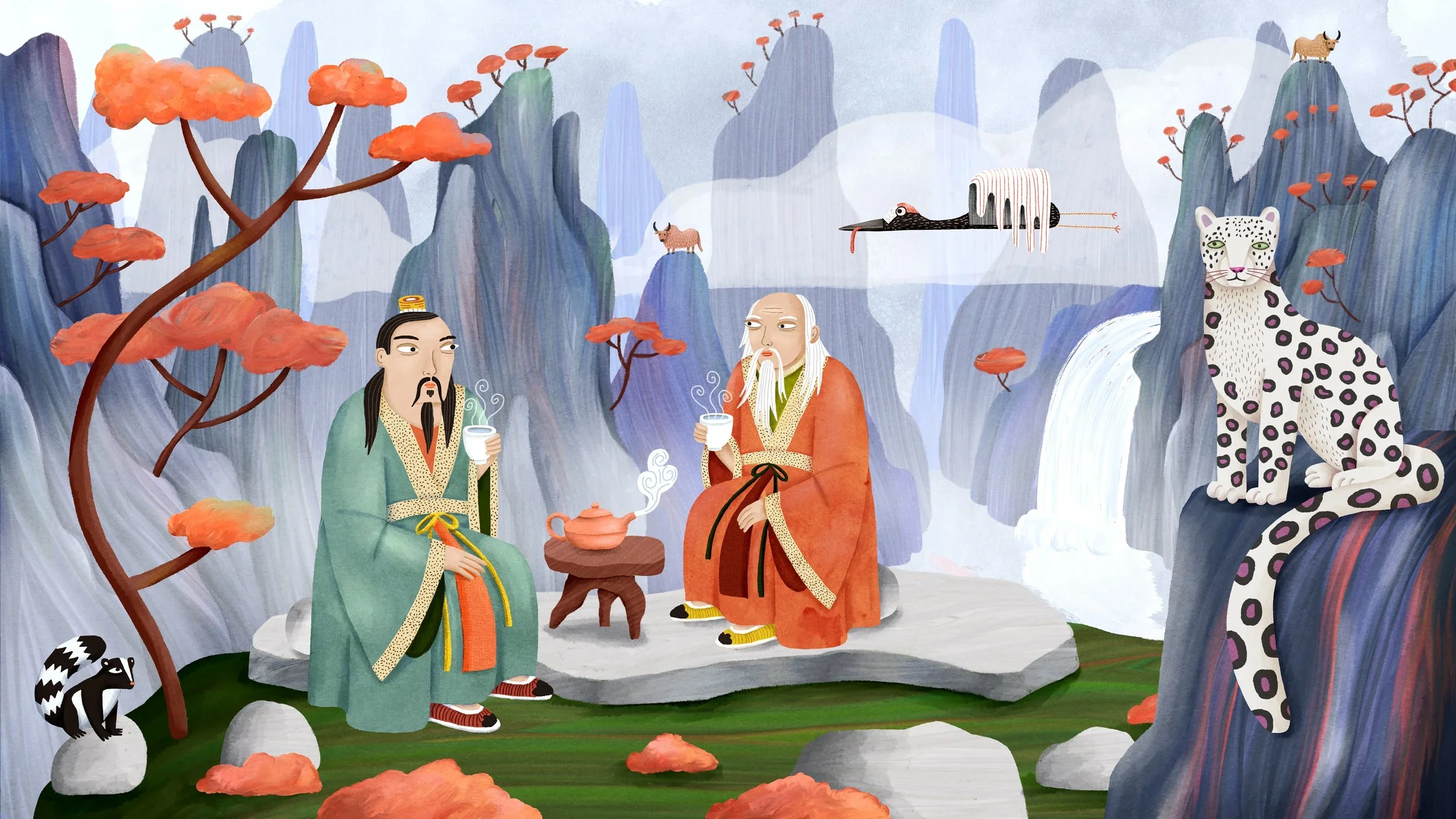Commissioned by Freethink Media, I developed the visual style and animatic for Yogi Tea's first animated commercial. The film traced tea through history as a force for connection - from conversations with Lao Tzu on a mountaintop, to the revolutionary fervor of the Boston Tea Party, Nelson Mandela disarming an Afrikaner general over tea, suffragettes gathered in solidarity, a children's tea party, and Georgia O'Keeffe sipping tea while painting. The project reached the animatic phase before it was unfortunately cancelled.